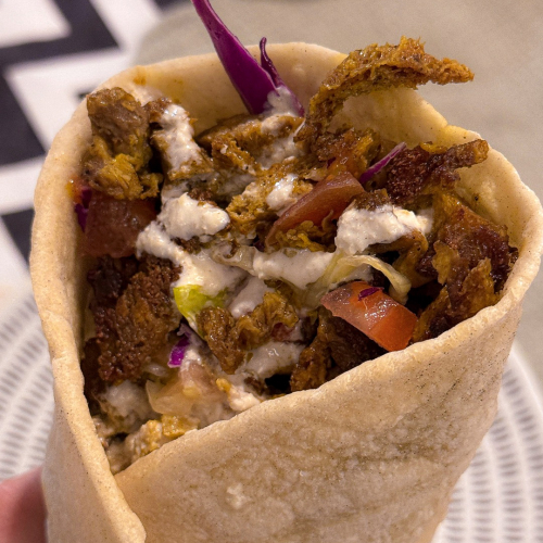 Shawarma de seitan adobado con especias libanesas, lechuga, tomate, repollo, cebolla colorada y salsa tahine envuelto en pan árabe