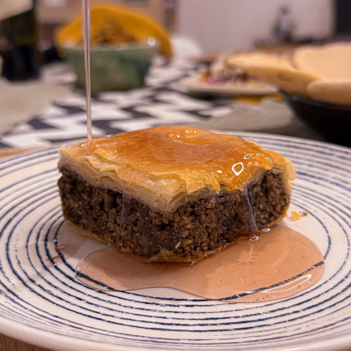 Postre tradicional árabe elaborado a base de masa filo y pasta de nueces, bañado en almíbar.