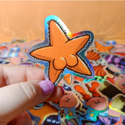 Sticker hecho con vinilo holográfico de la famosa estrella culona. Ideal para termos y exteriores