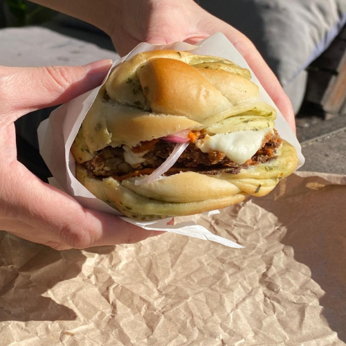 Sandwich de Roll de pesto con mila de girgolas, salsa de tomate asada y tapenade de aceitunas negras