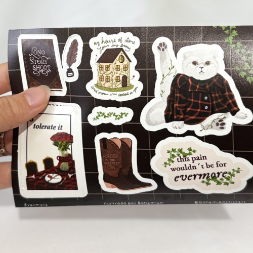 Planchas de stickers en Vinilo UV. Diseñadas por nosotras, resistentes al agua, al roce y al sol.