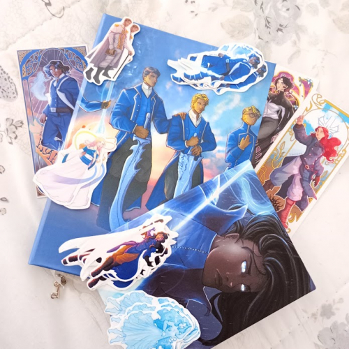 Variados productos del fandom de Cosmere, entre ellos cuadernos, señaladores, stickers, prints. Personajes de Stormlight Archive y Mistborn, así como de algunas novelas sueltas.
