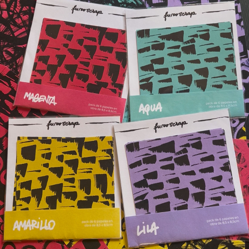 packs de 6 papeles obra para usar en tu scrap! disponible en magenta, lila, aqua y amarillo.