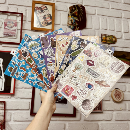 Plancha de vinilos inspirados series, pelis y artistas, están troquelados para que los despegues y uses directo.