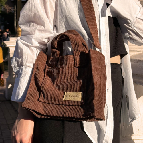 Mini bag realizada en corderoy, forrada y con avios plateados. Posee bolsillo externo y otro interno con cierre para mayor seguridad. Su correa es regulable y cierra con broches metálicos imantados.