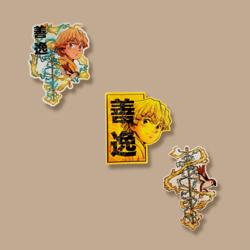 Incluye 3 unidades: sticker elemento Zenitsu, sticker especial Zenitsu y sticker exclusivo Zenitsu Están impresos en tinta UV, su calidad premium los hacen resistentes al agua, sol, rayaduras y roce continuo.